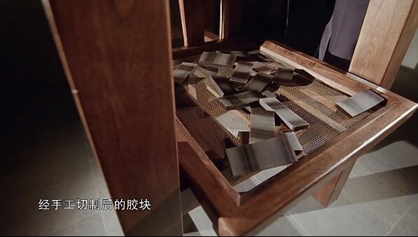 经手工切制后的胶块,需至于阴凉处。每隔三到四天翻动一次,使两面水分均匀发散,如此晾胶需两个月之久。水分与时间相互消磨,丝毫都急不得。