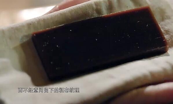 u蘸温水擦胶,能使胶块光黑如漆,而不经意间留下的粗布纹理成就了正品阿胶妙趣横生的品相。