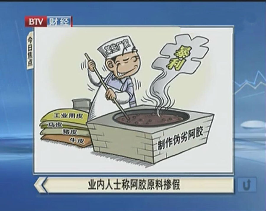 所谓“高仿阿胶”,其实是纯粹的假阿胶,也就是业内所称的“杂皮胶”,其原料来历不明,主要是用皮革的下脚料,还有的用马皮、猪皮、牛皮等各种杂皮制成,个别黑心厂家还会在原材料中加入工业明胶。